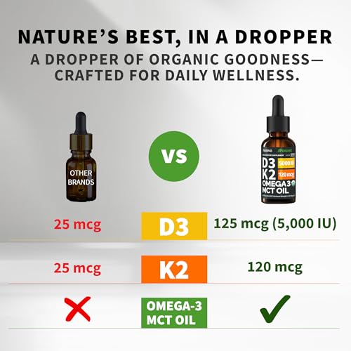 (2 Pack) Organic Vitamin D3 K2 Drops with MCT Oil Omega 3, 5000 IU, Maximum Strength Vitamin D Liquid, No Fillers, Non-GMO Liquid D3 for Faster Absorption and Immune Support (Unflavored, 2 Fl Oz)