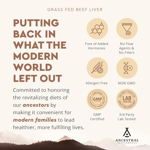 Ancestral Supplements Grass Fed Beef Liver 180 Capsules, Supports Energy Production, Detoxification, Digestion, Immunity and Full Body Wellness, Non-GMO, Freeze Dried Liver Health Supplement