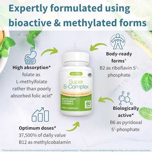 Igennus Super B-Complex Methylated B Vitamins, All Day Nutrient Delivery, Clean Label, MTHFR Supplement with Methylfolate & B12 Methylcobalamin, Vegan, Lab Verified, 60 Small Tablets
