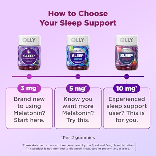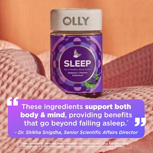 OLLY Sleep Supplements are delicious bedtime buddies that help you mellow your mind, calm your senses and relax into Zzzs.* These sleep support gummies are expertly blended with 3 mg Melatonin per 2 gummies and L-Theanine to support a healthy sleep cycle. L-Theanine encourages calmness so you can drift off. Melatonin, a sleepy time superstar ingredient, helps you fall asleep and stay asleep.* These gummies also have a blend of traditionally used herbal helpers: Chamomile, Passionflower & Lemon Balm Extract. OLLY Sleep gummies are a delightful addition to your routine. Take 2 gummies 30 minutes before bed, chew thoroughly before swallowing. These nighttime heroes are deliciously flavored with blissful blackberry and mint flavors with other natural flavors. Formulated with no synthetic flavors or colors, gluten free and drug free. *These statements have not been evaluated by the Food and Drug Administration. This product is not intended to diagnose, treat, cure or prevent any disease. For occasional sleeplessness. CAUTION: Melatonin may cause drowsiness or sleepiness; do not take while driving, operating machinery, or engaging in any activity that requires alertness. This product is not intended to treat insomnia or other sleep disorders.