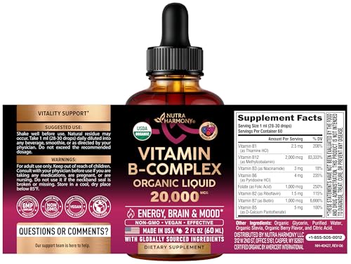 USDA Organic Vitamin B-Complex B5 Pantothenic Acid | B12 Methylcobalamin | B1 Thiamine | B6 Pyridoxine | B7 Biotin | B9 Folic | B3 Niacinamide – B Complex Liquid Drops, Made in USA Supplement, 2fl oz