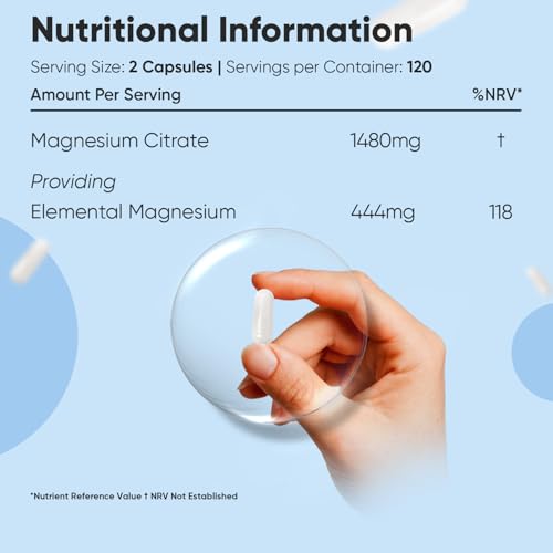 1480MG OF MAGNESIUM CITRATE: Each serving contains 1,480 mg of magnesium citrate, providing 444 mg of elemental magnesium. It is a well-tolerated, stable and gentle form of this key mineral. These capsules offer a concentrated amount for those looking to include more magnesium in their daily intake