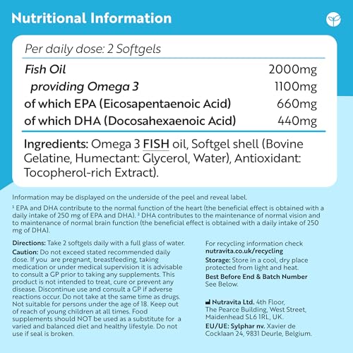 EFSA-Approved EPA & DHA Claims: EPA and DHA contribute to the normal function of the heart, while DHA contributes to the maintenance of normal brain function and normal vision.* (EFSA) This omega 3 fish oil 2000mg formulation meets these beneficial effect levels. Suitable for those exploring fish oil capsules high strength, omega 3 high strength, and omega-3 supplement routines.