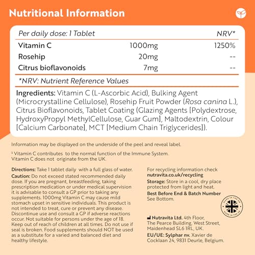 Why Nutravita’s Vitamin C With Bioflavonoids and Rosehip? – Our supplement contains 1,000mg of Vitamin C, enhanced with essential Rosehip – sourced from the fruits of a rose hip plant – and Citrus Bioflavonoids. Both are naturally occurring plant pigments to complement the action of Vitamin C. The 9mm oval tablets have been designed so you only need to take 1 tablet to meet your daily NRV. If you find the tablets large, you can crush the tablet and sprinkle over food to ingest.