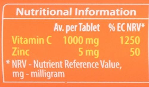 Tablet Ingredients: Vitamin C (Ascorbic Acid), Acidity Regulator: Sodium Bicarbonate, Citric Acid, Sweeteners: Sorbitol & Sucralose, Natural Orange Flavouring, Maize Starch, Natural Source Colours: Betacarotene Prep. & Redbeet Powder, Zinc Citrate.